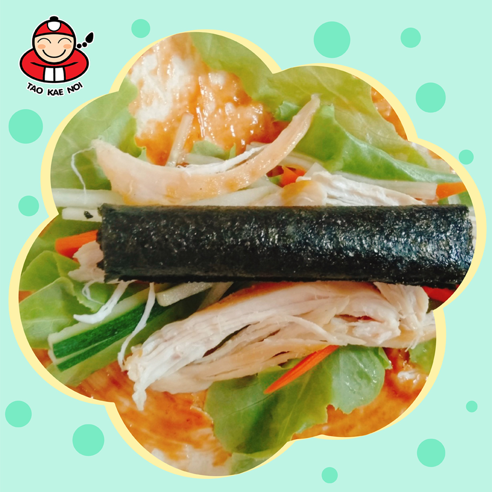 4. Prepare the cooked tortillas, apply the tomato sauce around the whole piece. Then, put the green oak, carrots, cucumbers, Taokaenoi big roll and chicken on the tortillas.